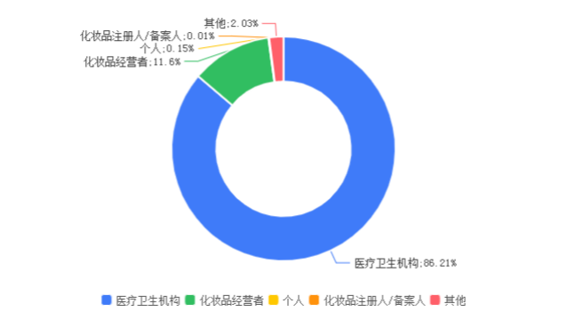 2024年全市化妆品不良反应报告来源于医疗卫生机构、化妆品经营者、个人、化妆品注册人、备案人及其他。报告来源以医疗卫生机构为主,有6724份,占86.21%;其次是化妆品经营者,有905份,占11.60%;个人报告12份,占0.15%;化妆品注册人、备案人报告1份,占0.01%;其他报告158份,占2.03%,详见图2。