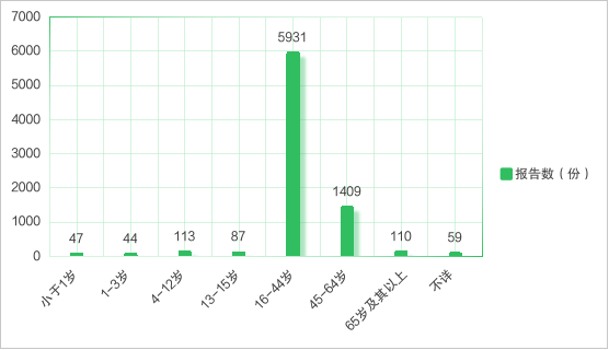 从患者/消费者性别分布情况来看,涉及男性报告844份,占10.82%,男性比例高于2023年(1:9.78),相较2017年男性比例增加了约1.5倍;涉及女性报告6956份,占89.18%,男女性别比为1:8.24,详见图3。