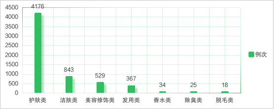 在5992例次普通化妆品中,以护肤类为主,有4176例次;其次为洁肤类,有843例次;脱毛类(2021年1月1日后备案)最少,仅有18例次。详见图5。
