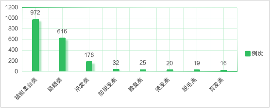 在1876例次特殊化妆品中,排名前三的分别为祛斑美白类972例次,防晒类616例次,染发类176例次,详见图6。