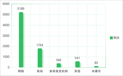 化妆品不良反应报告的产品来源为网购、商场和美容美发机构等,详见图7。自2017年国家化妆品不良反应监测系统上线以来,除2018年产品网购来源占比略有下降外,自2019年起产品网购来源占比连续六年增加,2024年产品网购来源占比达到65.55%,高出2023年网购占比3.85个百分点,高出同年商场占比1.96倍,是2017年网购占比的2.32倍。